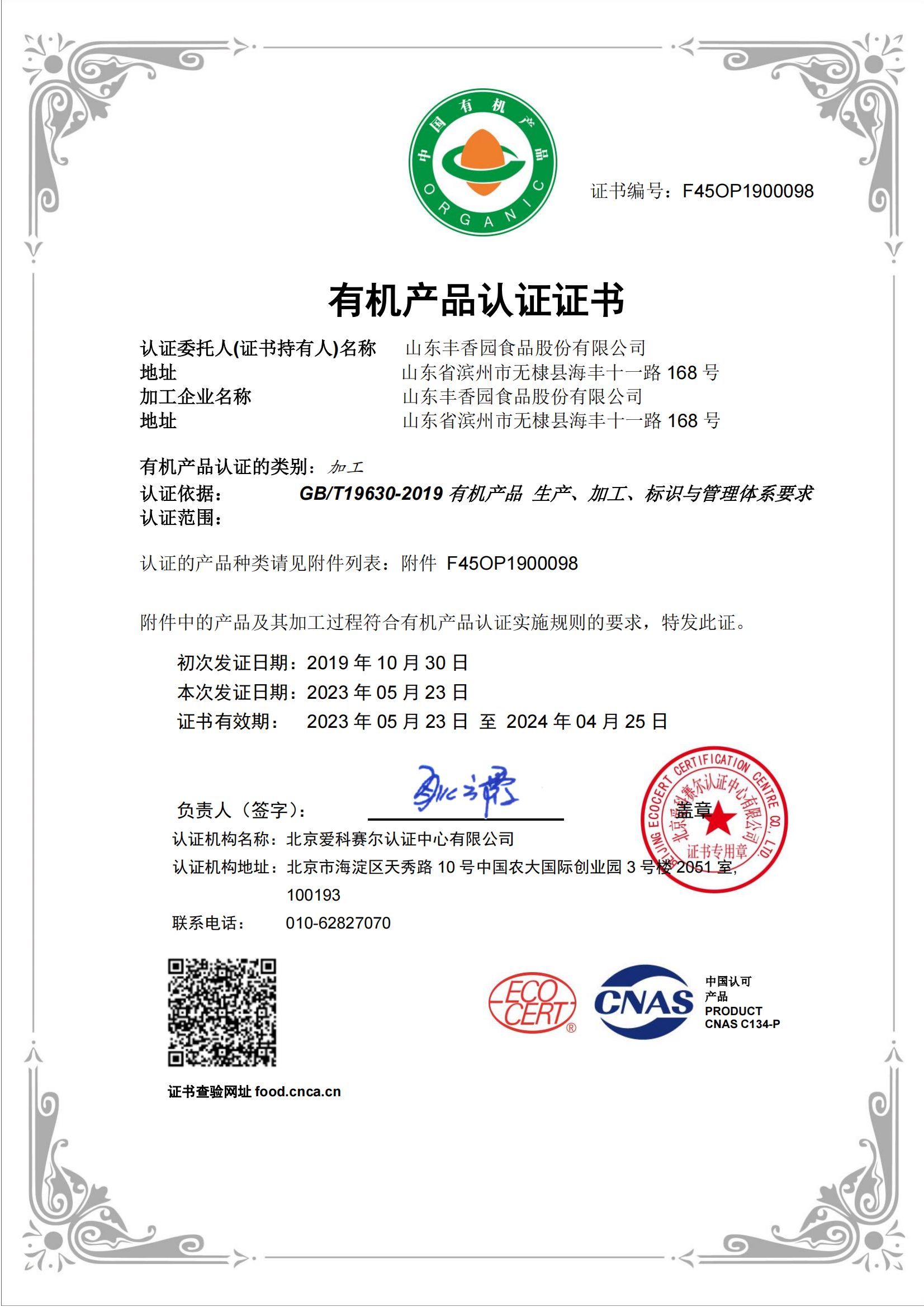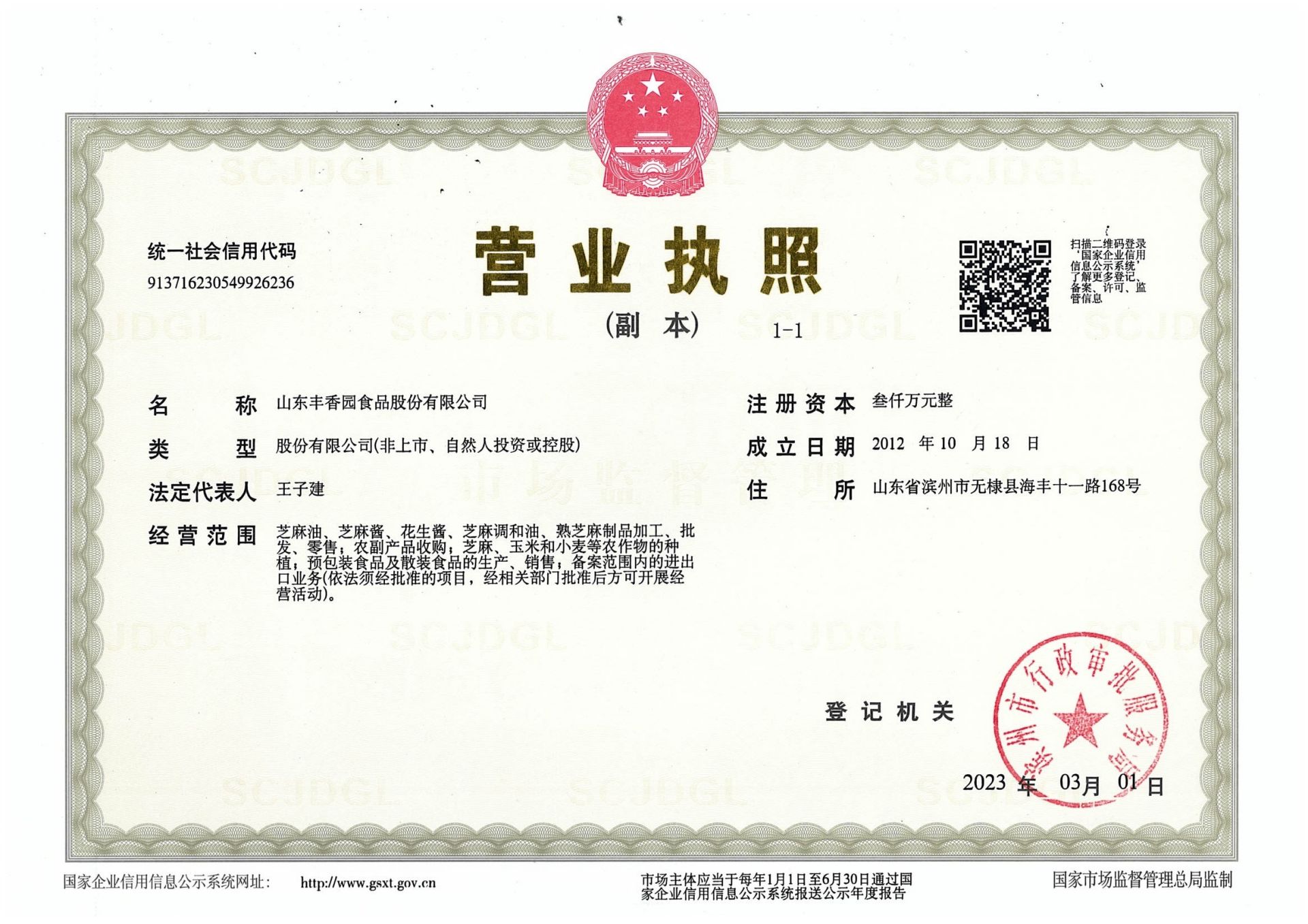山東豐香園食品股份有限公司位于無棣縣西城工業園,成立于2012年,注冊資本3000萬元,員工60多人,年銷售收入8000多萬元,是“國家高新技術企業”、“中國好糧油”示范企業、“食安山東”示范生產加工企業,公司集綠色、有機芝麻食品標準化、生產加工、研發、出口銷售為一體的山東省農業產業化“重點龍頭企業”。 公司獲得HACCP國際質量體系認證、ISO9001:2015質量管理體系認證,產品獲得美國FDA認證、美國、歐盟有機食品認證、英國BRC體系認證、A級綠色食品認證、GB國標有機食品認證。 公司主要產品有芝麻油、芝麻醬、花生醬、芝麻粉和烘焙芝麻、兒童芝麻食品系列等六大種類上百個品種,產品出口美國、日本、韓國、新加坡、俄羅斯、澳大利亞、美國、等30多個國家。2018-2019年連續兩年芝麻食品出口量排名山東省第三位、濱州市第一位。 山東豐香園食品股份有限公司是國家級高新技術企業,建有省級“一企一技術”研發中心、市級企業技術中心和市級工程實驗室、市級工程技術中心等多個創新平臺,擁有發明專利2項,實用新型專利21項,先后獲得省級“專精特新”中小企業、市級農業產業化聯合體、科技型中小企業、濱州市級瞪羚企業、市級“一企一技術”創新企業和濱州市新興產業“白名單”企業等榮譽稱號。